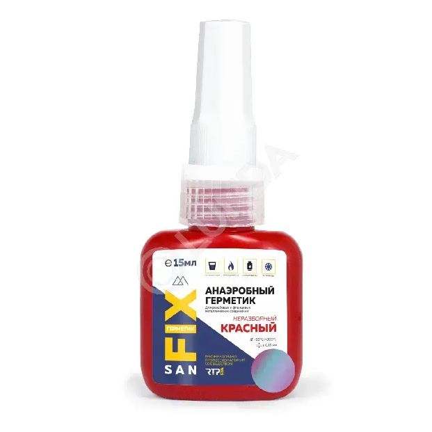 Анаэробный герметик Sanfix – жидкое полимерное вещество, используемое для уплотнения и герметизации металлических резьбовых соединений. Попадая в узкое безвоздушное пространство, при контакте с металлом материал полимеризуется (затвердевает), полностью закрывая имеющееся свободное пространство внутри узла. Состав обеспечивает герметичность соединений в трубопроводах с водой, газом, нефтью и нефтепродуктами. Резьбовое соединение получает дополнительную защиту от коррозии.Анаэробный герметик заменяет льняные волокна и фторопластовые ленты и применяется для установки и фиксации металлических соединений с резьбовым профилем (не подходит для цинковых, алюминиевых, кадмиевых и серебряных сборок). Состав повышает устойчивость к вибрациям и выдерживает повышенное давление.